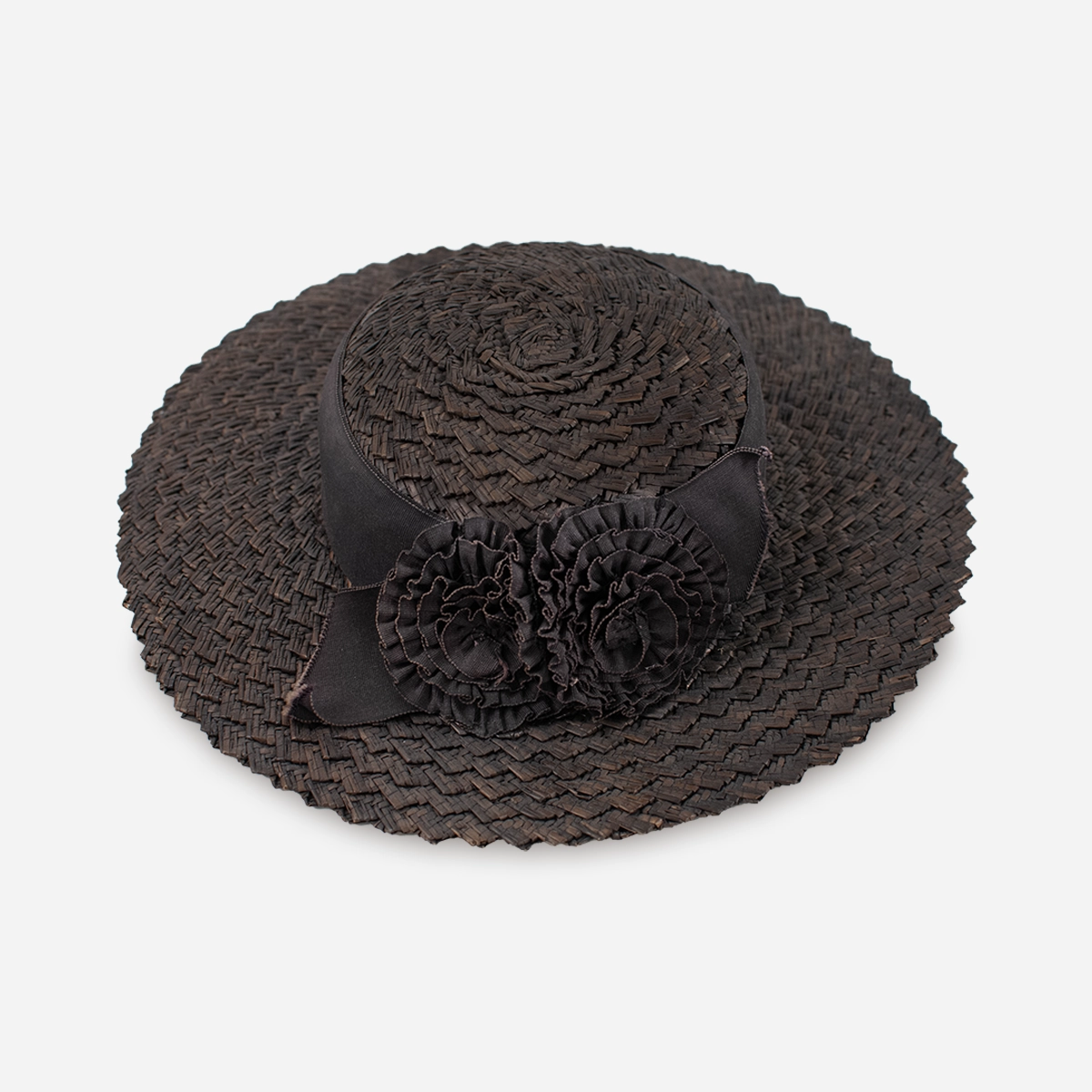 This hard straw hat is hand constructed from wide flat split-straw braid, spiral-sewn for durability and shape, and finished with a broad brown grosgrain ribbon band accented by softly ruffled ribbon flowers.