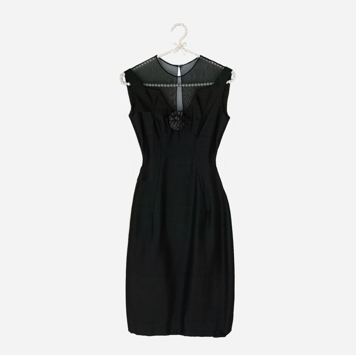 Slip into a little California glamour with this 1960s Marsi’s black silk cocktail dress — a classic 1960s wiggle dress with a sleek, curve-conscious silhouette.She’s the definition of refined drama: a sculpted silk bodice topped with a sheer illusion neckline and finished with a handmade ribbon rosette right at the bust. The fit is sleek, shapely, and very XXS — the kind of dress that means business at a holiday party or a swanky dinner.