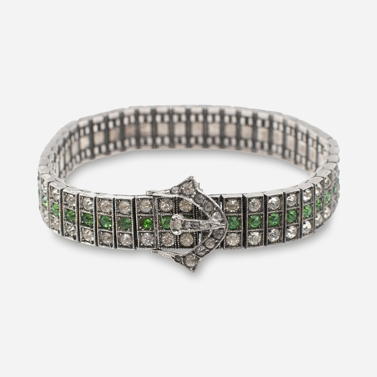 This 1920s Art Deco Diamonbar bracelet brings the crisp geometry, the emerald-green flash, and that unmistakable buckle clasp. Sterling through and through. A two-row bracelet is available here.
