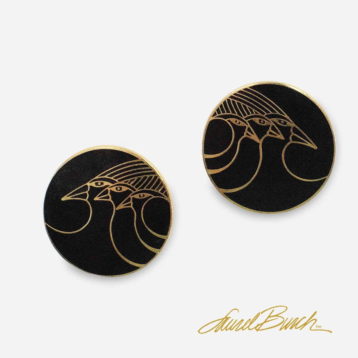 A signature Laurel Burch design—bold, graphic, and instantly recognizable. These round disc earrings feature her iconic “Celestial Birds” motif, rendered in gleaming gold-tone lines against a rich black enamel ground.