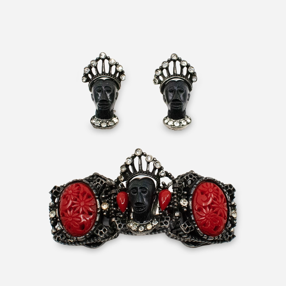 This signed Selini jewelry set offers a rare opportunity to acquire both the bracelet and matching clip earrings together. Sculptural figural heads in the Blackamoor style anchor each piece, crafted in molded black resin and finished with rhinestone accents. Deeply carved red resin cabochons introduce contrast and visual rhythm, giving the set its unmistakable mid-century presence.