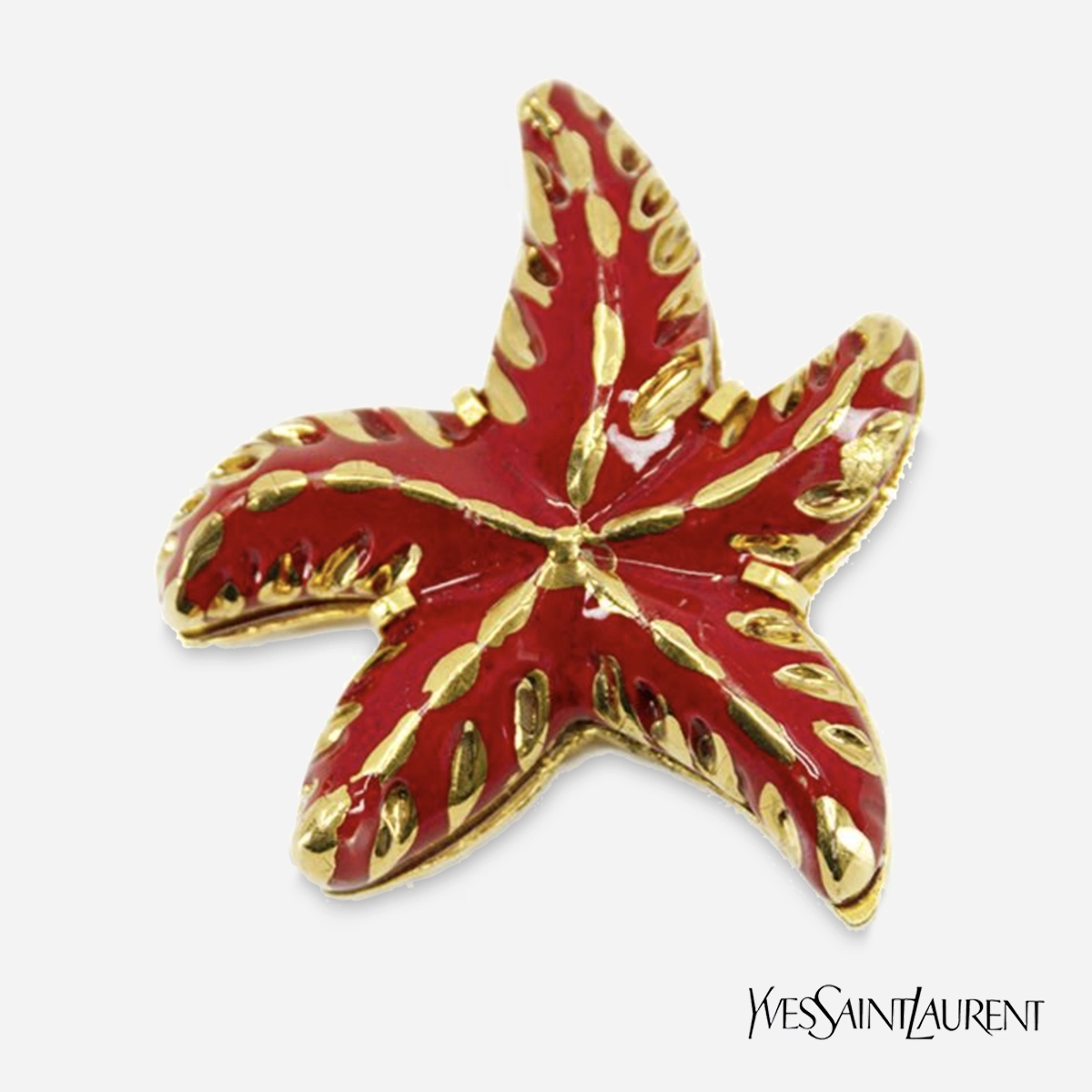 Bright red YSL brooch is a fun starfish pin from Yves Saint Laurent jewelry.